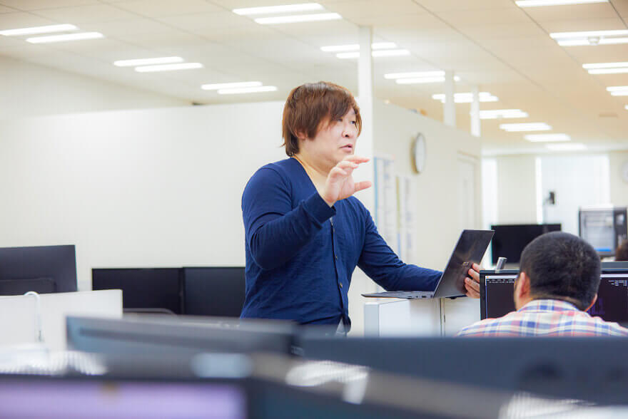スタッフによって内容が異なりますが、人員計画・見積業務・プロジェクト全体の工程管理などの管理業務や、クライアントや外部会社とのやり取り、ゲーム内容の企画提案・仕様策定・シナリオ制作・ゲームデータの設計から実装・各種データの実装の発注、各種ゲームアセットのディレクションなど様々です。業務はプロジェクトごとに、得意分野を中心にスタッフごとに分業して行っています。